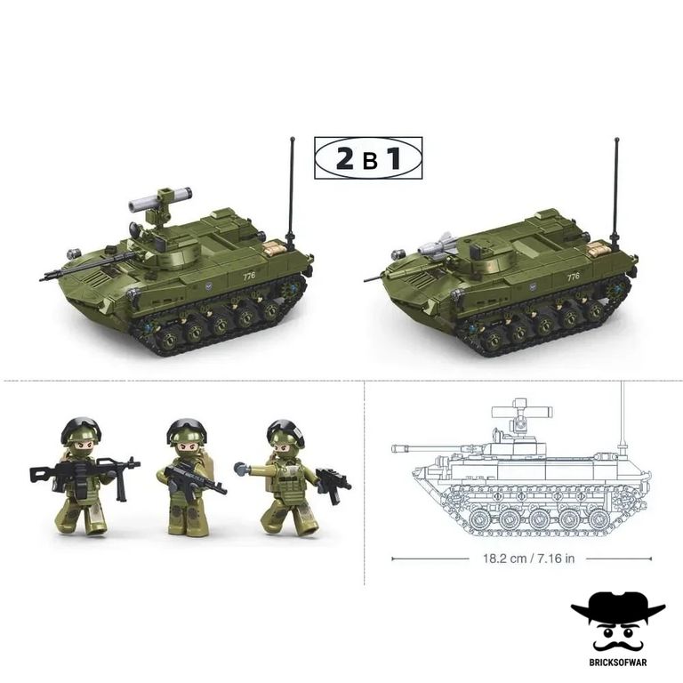 Создайте реалистичный российский военный транспорт с помощью конструктора, включающего БМД (Боевая машина десанта) и три фигурки солдат.