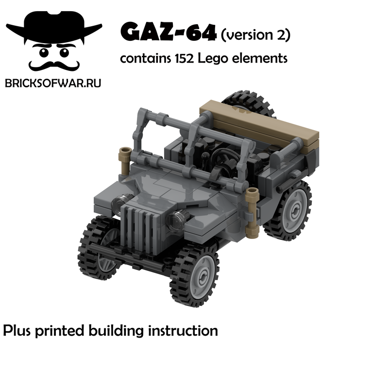 Набор советского внедорожника ГАЗ-64 из оригинальных деталей Лего. В комплекте цветная инструкция по сборке.