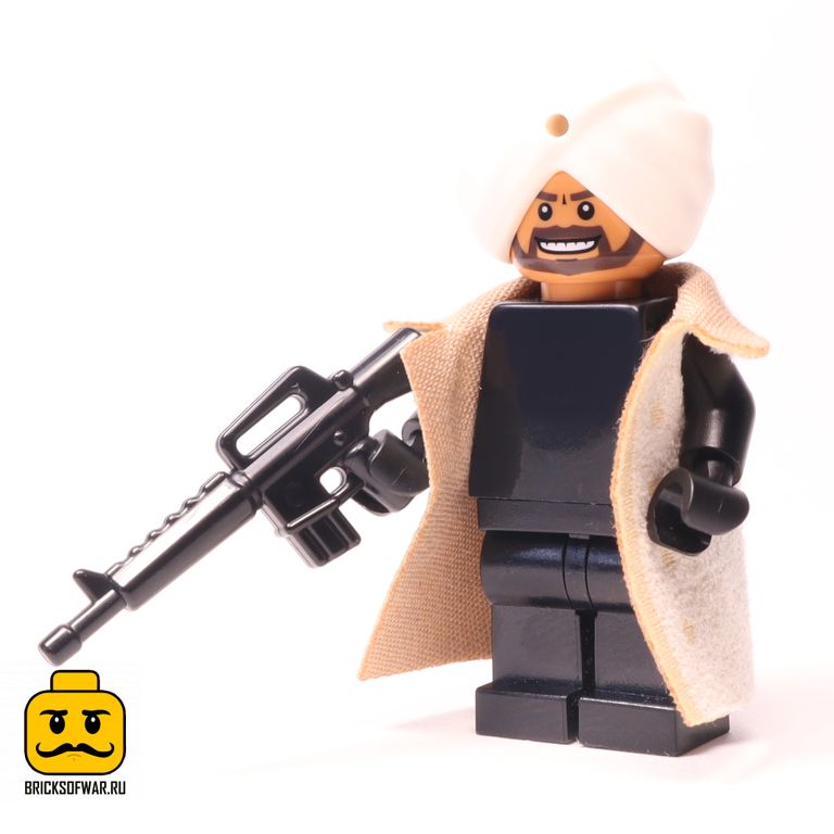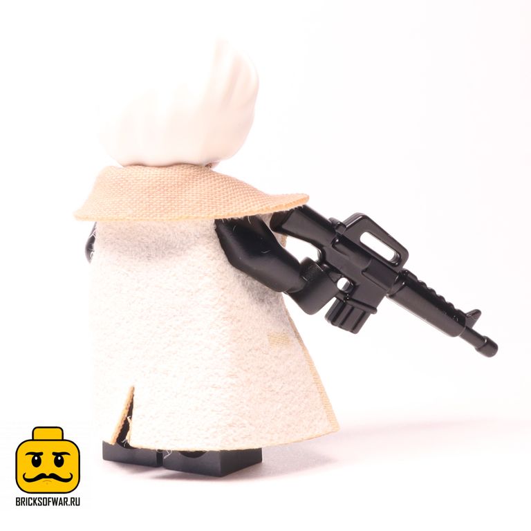 Оригинальная минифгурка Лего с автоматом БрикАрмс и плащом.