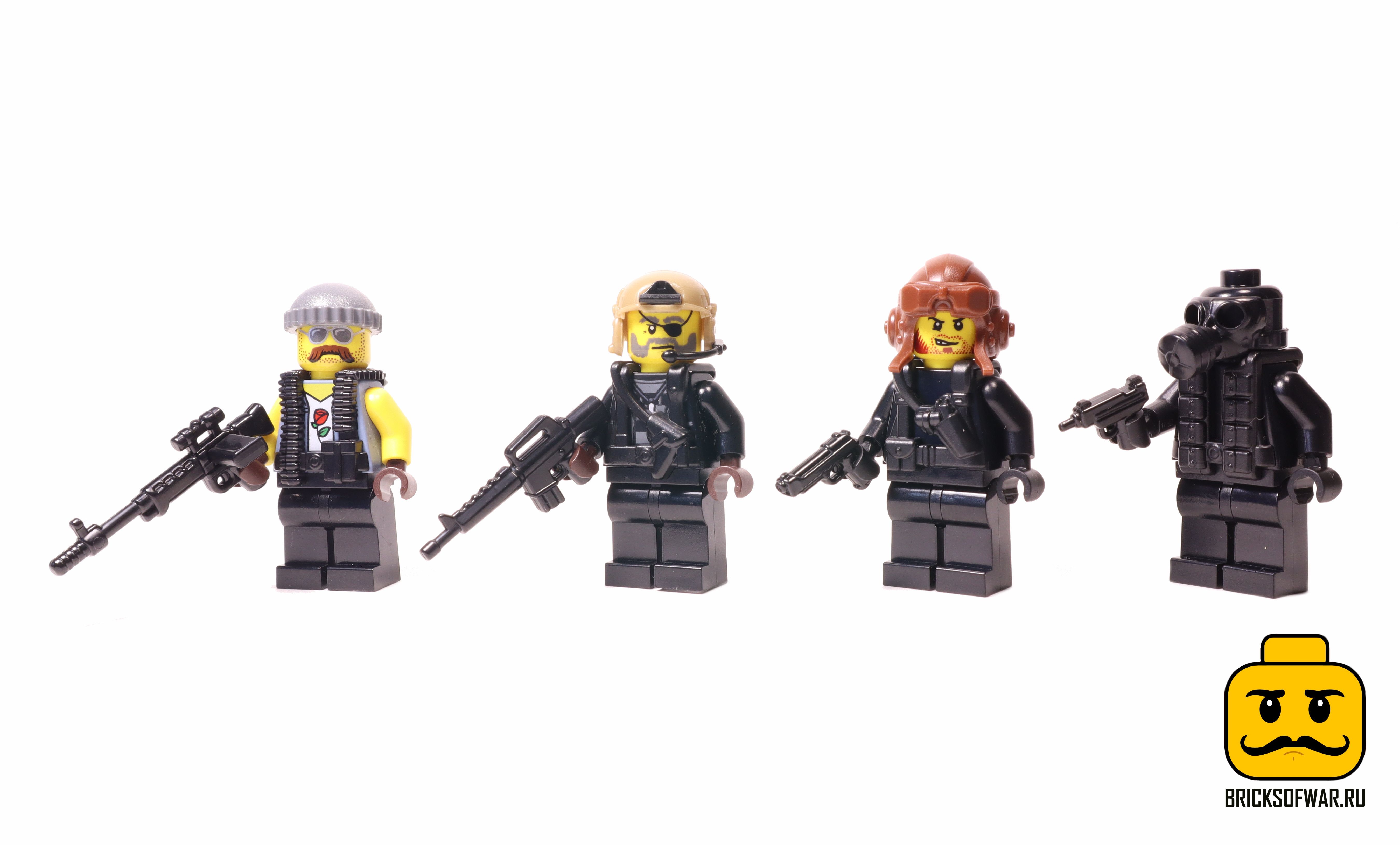 Четыре оригинальные минифгурки Лего с оружием и аксессуарами от Combat Brick и BrickArms.