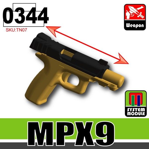 Детализированная модель пистолета MPX9 от MinifgCat (Si-Dan Toys). Имеет сдвигающийся затвор. Пользуется особенной популярностью у создателей Лего-мультиков, за возможность создать сцену с реалистичным выстрелом.